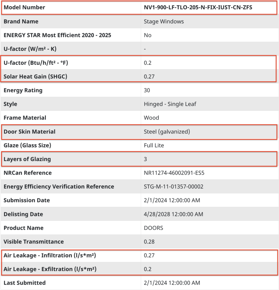 For example, here is what you might find when checking Ecoline doors we made with Stage using its model number NV1-900-LF-TLO-205-N-FIX-IUST-CN-ZFS on the Energy Star: