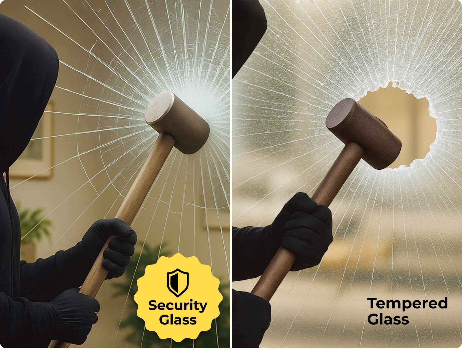 When impacted, the glass doesn’t shatter into loose shards. Instead, it forms a spiderweb-like crack pattern, with fragments remaining attached to the interlayer. This makes the pane far more challenging to break through while still keeping its shape in the frame.